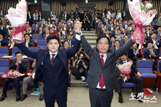 16일 서울 여의도 국회에서 열린 국민의힘 원내대표 선출 의원총회에서 새 원내대표로 당선된 송언석 의원이 김용태 비상대책위원장과 함께 두 팔 들어 인사하고 있다.