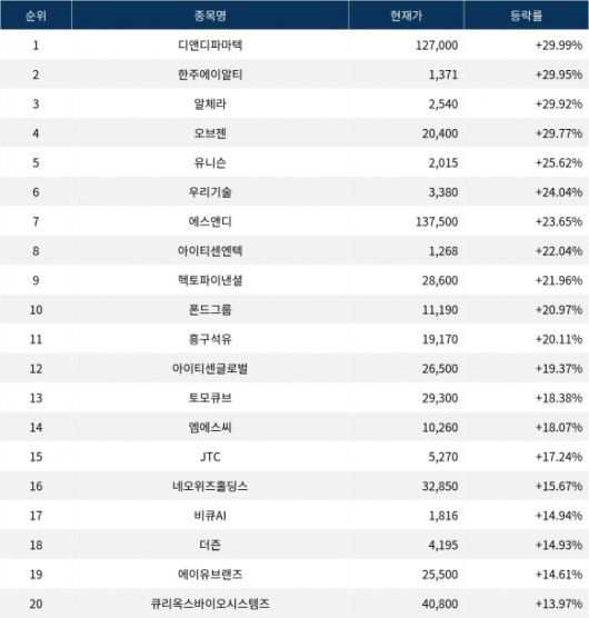 6위 우리기술(032820)은 종가 3,380원으로 24.04% 상승 마감했다. 7위 에스앤디(260970)는 종가 137,500원으로 23.65% 상승 마감했다. 8위 아이티센엔텍(010280)은 종가 1,268원으로 22.04% 상승 마감했다. 9위 헥토파이낸셜(234340)은 종가 28,600원으로 21.96% 상승 마감했다. 10위 폰드그룹(472850)은 종가 11,190원으로 20.97% 상승 마감했다.