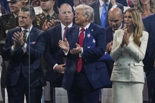 도널드 트럼프 미국 대통령이 부인인 멜라니아 여사와 14일(현지 시간) 미국 워싱턴DC에서 열린 미 육군 250주년 군사 퍼레이드를 지켜보며 박수치고 있다. 2025.06.15 워싱턴=AP 뉴시스 |