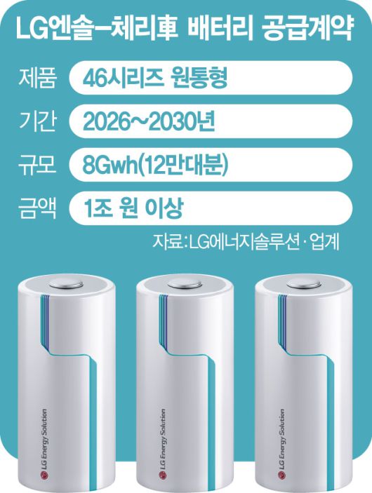 LG에너지솔루션은 중국 체리차의 자회사를 통해 46시리즈 원통형 배터리 공급계약을 체결했다고 16일 밝혔다. LG에너지솔루션은 내년 초부터 2030년까지 소형 전기차에 사용될 원통형 배터리를 공급하는데 8GWh(기가와트시) 규모로 전기차 약 12만 대 분량이다. 수주 금액은 비공개로 했지만 업계는 1조 원 이상으로 보고 있다.