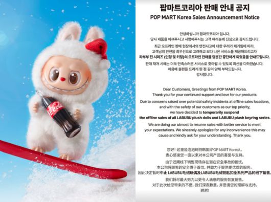 지난 15일 팝마트코리아 측은 공식 인스타그램을 통해 “오프라인 판매 현장에서의 안전사고에 대한 우려가 제기됨에 따라 고객님의 안전을 최우선으로 고려하고, 보다 나은 서비스를 제공하고자 라부부 전 시리즈(인형 및 키링)의 오프라인 판매를 당분간 중단하게 됐음을 알린다”는 공지글을 올렸다.