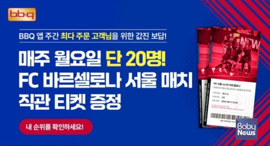 BBQ는 이번 프로모션이 시작된 지난 11일부터 15일까지 BBQ앱에서 치킨을 가장 많이 주문한 고객 20인을 공개하고, 해당 경기의 1등석 티켓을 각 2장씩 증정했다. 선정된 전원에게 1등석을 제공하는 'TOP 20’ 이벤트는 프로모션이 끝나는 7월 20일까지 매주 진행되며, 중복 당첨도 가능하다.