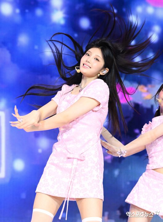 이날 쇼케이스에 참석한 아일릿 원희가 타이틀곡 '빌려온 고양이' 무대를 펼치고 있다.