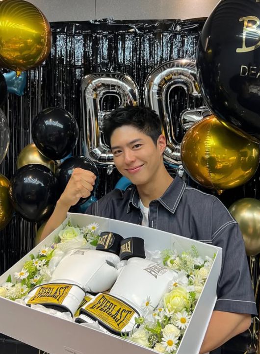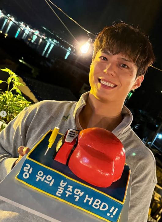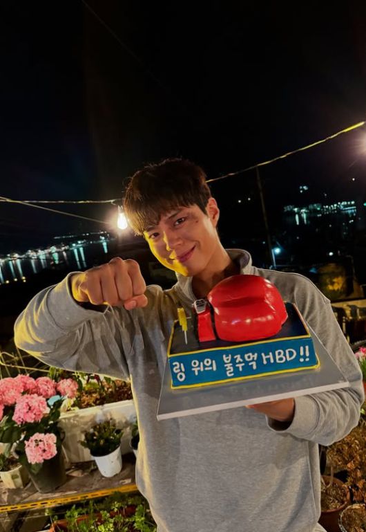 공개된 사진 속 박보검은 ‘굿보이’ 제작진이 준비한 특별한 케이크를 들고 환하게 웃고 있다. 특히 케이크는 극 중 그의 역할에 맞춰 권투 글러브와 링 모양으로 제작되었으며, “링 위의 불주먹 HBD!!”라는 문구가 더해져 눈길을 끈다.
