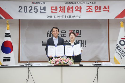 [스포츠서울ㅣ춘천=김기원기자]강원특별자치도(도지사 김진태)와 강원특별자치도청공무직노동조합(이하 ‘교섭대표노동조합’)은 6월 16일(월) 도청 회의실에서 2025년 단체협약 조인식을 개최하고 협약을 체결했다.