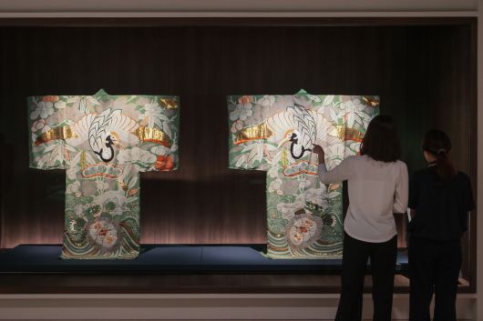 17일 국립중앙박물관에서 개막하는 특별전 ‘일본미술, 네 가지 시선’에 출품된 ‘옷 모양 이불’. 옷처럼 보이는 에도 시대 이불이다. 한 쌍을 나란히 놓으면 부리를 벌린 학과 다문 학이 서로 마주 보게 된다. 이는 원만한 부부 사이를 상징한다. [연합] |