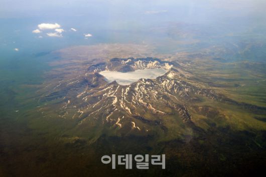 [중국(지린성)=이데일리 이영훈 기자] 지난 13일 중국 연길에서 인천 국제공항으로 향하는 상공에서 촬영한 백두산 천지의 모습이다.