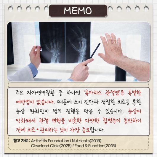 주요 자가면역질환 중 하나인 '류마티스 관절염’은 특별한 예방법이 없습니다. 때문에 조기 진단과 적절한 치료를 통한 증상 완화만이 병의 진행을 막을 수 있습니다. 증상이 악화돼서 관절 변형을 비롯한 다양한 합병증이 동반하기 전에 치료‧관리하는 것이 가장 중요합니다.