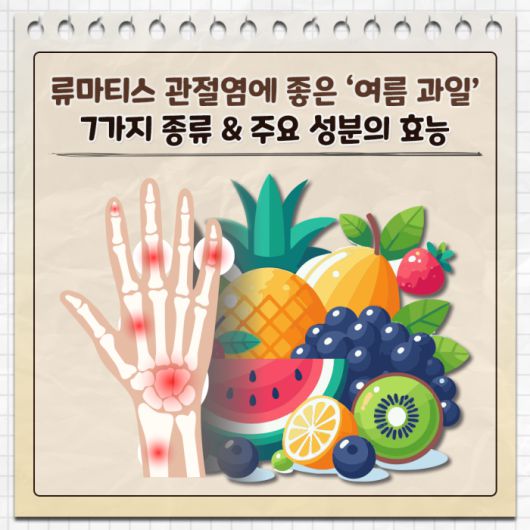 여름은 신선한 과일의 계절입니다. '류마티스 관절염’이 있다면, 건강한 식단을 위해 제철 과일의 섭취를 늘려보세요. 여름 과일에는 △항산화제 △비타민 △미네랄 △섬유질 및 유기 화합물인 폴리페놀 등이 풍부해서 류마티스 관절염의 염증을 완화하고, 세포 손상을 일으키는 산화 스트레스를 줄이는 데 도움이 됩니다. 여름 제철 과일 7가지를 추천합니다.