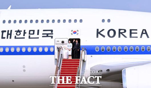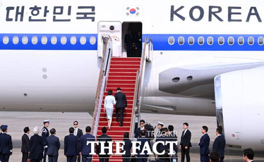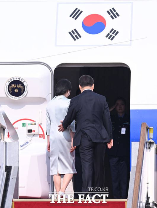 [더팩트ㅣ서울공항=이새롬 기자] 주요 7개국(G7) 정상회의 참석을 위한 첫 해외 순방길에 나선 이재명 대통령과 김혜경 여사가 16일 오후 경기 성남시 서울공항에 도착해 공군 1호기에 올라 인사하고 있다.