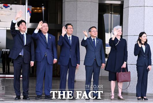 강훈식 비서실장과 김병기 더불어민주당 대표 직무대행 겸 원내대표, 우상호 대통령실 정무수석, 고기동 행정안전부 장관 직무대행, 타마라 모휘니 주한 캐나다 대사, 김진아 외교부 2차관(오른쪽부터)이16일 오후 경기 성남시 서울공항에서 G7 정상회의 참석을 위해 순방길에 오른 이재명 대통령을 배웅하며 손을 흔들고 있다. /서울공항=이새롬 기자 |