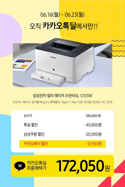 [디지털포스트(PC사랑)=임병선 기자] 소형 컬러 레이저 프린터의 대표주자 '삼성전자 SL-C513W'를 6월 카카오 톡딜 특가 행사에서 파격적인 할인 혜택으로 구매할 수 있다. 6월 16일(월) 오후 5시부터 6월 23일(월) 자정까지, 무선 컬러 레이저 프린터 SL-C513W 모델을 카카오 톡딜을 통해 최대 30% 할인된 가격인 실구매가 172,050원으로 구매가 가능하다.