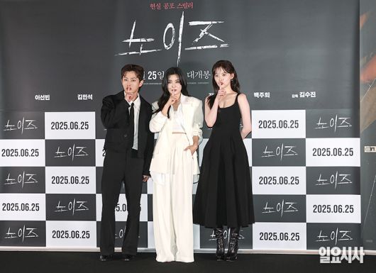 배우 김민석(왼쪽부터) 이선빈, 한수아가 16일 오후 서울 강남구 코엑스 메가박스에서 열린 영화 <노이즈> 언론배급시사회 및 기자간담회에서 포토타임을 가지고 있다.