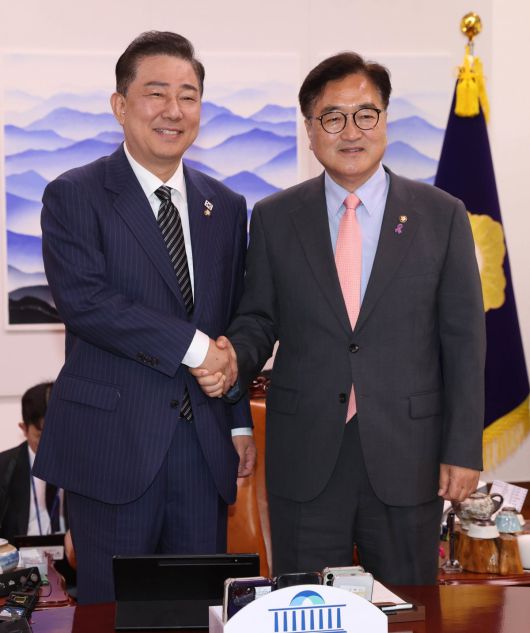 우원식 국회의장과 김병기 더불어민주당 신임 원내대표가 16일 오전 서울 여의도 국회의장실에서 악수하고 있다. 사진공동취재 |