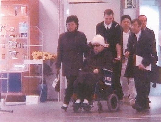 2004년 유방암 치료를 위해 프랑스 파리를 찾은 고용희가 두꺼운 흰색 털모자를 쓰고 휠체어에 앉아있다. 모자나 수행원들의 차림을 보아 늦겨울이나 초봄으로 추정된다. 고미 요지 제공 |