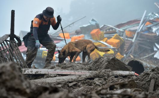 2023년 7월 16일 오전 경북 예천군 효자면 백석리의 한 마을이 집중호우로 인한 산사태에 휩쓸린 가운데 수색견을 동원해 실종자 수색작업을 벌이고 있다. (뉴시스) |
