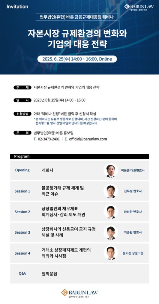 [서울=뉴스핌] 김현구 기자 = 법무법인 바른(이동훈 대표변호사)이 오는 25일 오후 2시부터 4시까지 '이재명 정부의 자본시장 규제 환경 변화와 기업의 대응 전략'을 주제로 웨비나(화상토론회)를 개최한다고 16일 밝혔다.