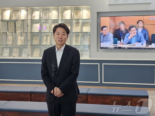 이준석 의원이 16일 용인시청 1층 로비에서 브리핑을 갖고 용인시청을 방문한 이유와 정치현안 등에 대해 발언을 하고 있다. 2025.6.16/뉴스1 ⓒ News1 김평석 기자 |