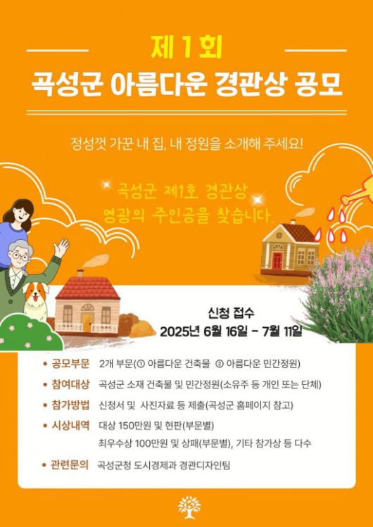 전남 곡성군(군수 조상래)은 주민들이 일상에서 정성껏 가꾼 아름다운 경관을 발굴하고 자발적인 경관관리 문화를 확산하기 위해 '제1회 곡성군 아름다운 경관상' 공모를 추진한다고 16일 밝혔다.