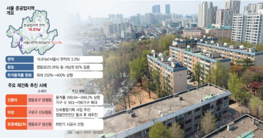 영등포구와 구로구 등에서 재건축 등 정비사업 논의가 한창인 이유는 서남권 일대가 준공업 지역 규제 완화 대표 수혜지역으로 꼽히기 때문이다. 준공업지역은 1960~70년대 소비·제조 산업 중심지로 경제 성장을 주도했다. 서울에는 19.97㎢가 준공업지역으로 지정돼 있으며 이 중 82%가 서남권에 분포돼 있다. 영등포구(25.16%)가 가장 넓은 가운데 △구로구(21.01%) △금천구(20.64%) △강서구(14.62%) 등이 뒤를 이었다.