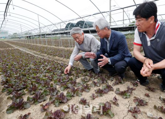 [이데일리 김태형 기자] 강호동(왼쪽) 농협중앙회장이 지난 13일 부산 강서구 대저동 소재 엽채류 재배농가를 찾아 생육동향을 점검하고, 3개 지역농협과 공판장에서 현장경영을 실시했다.