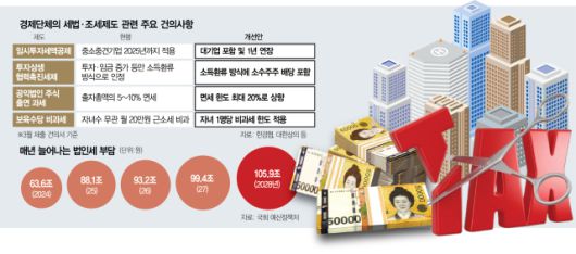 16일 국회 예산정책처와 기획재정부 등에 따르면 올해 기업들이 부담하는 법인세는 88조 원 이상으로 지난해보다 40% 안팎 증가할 것으로 전망된다. 3대 국세인 법인세는 삼성전자 등의 영업 실적 감소로 2년 연속 줄었다가 올해 가까스로 반등할 것으로 예상된다. 이후 법인세는 앞으로 4년간 연평균 13.6%씩 늘어 2028년에는 100조 원 고지를 밟게 된다. 이는 그만큼 우리 경제가 성장한다는 가정에 따른 전망치이기는 하지만 미국·중국 등 글로벌 기업들과 막대한 시설투자 및 연구개발(R&D) 경쟁을 벌여야 하는 기업 입장에서는 매년 불어나는 세금이 부담스러울 수밖에 없다.