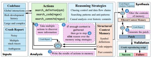 이후 충분한 컨텍스트 정보가 축적되면 생성 단계로 전환, 관련 없는 데이터를 걸러낸 뒤 여러 파일에 걸쳐 존재하는 결함 가능성이 있는 코드 조각을 식별하고 패치를 생성한다.