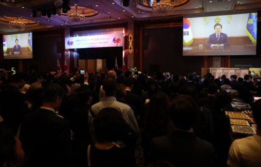 주요 7개국(G7) 정상회의 참석 탓에 이 자리에 불참한 이재명 대통령은 영상을 통해 축사를 보냈다. 이 대통령은 “1965년 6월 22일 한일 기본조약과 후속 협정을 체결하며 양국 간의 새로운 협력의 시대가 시작됐다”며 “이후 60년 동안 우리 양국은 경제, 문화, 인적 교류 등 다양한 분야에서 괄목할 만한 발전을 함께 이루어 왔다”고 평가했다. 이어 “1965년 당시에는 약 2억 달러 정도였던 교역 규모가 2024년에는 약 700억 달러를 넘어서서 350배 가량 증가했고, 연간 1만 명 수준이던 인적 결과 이제는 1200만 명을 돌파했다”며 “2002년 한일 월드컵은 대한민국 국민을 하나로 이어주었고 문화 교류도 매우 깊어졌다”고 설명했다.