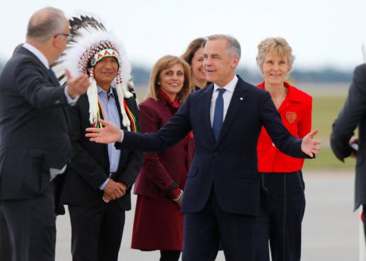 마크 카니 캐나다 총리(앞줄 가운데)가 15일(현지시간) 캐나다 앨버타주 캘거리에서 열리는 G7 정상회의 개막을 앞두고 캘거리 국제공항에 도착해 환영을 받고 있다. AFP연합뉴스 |