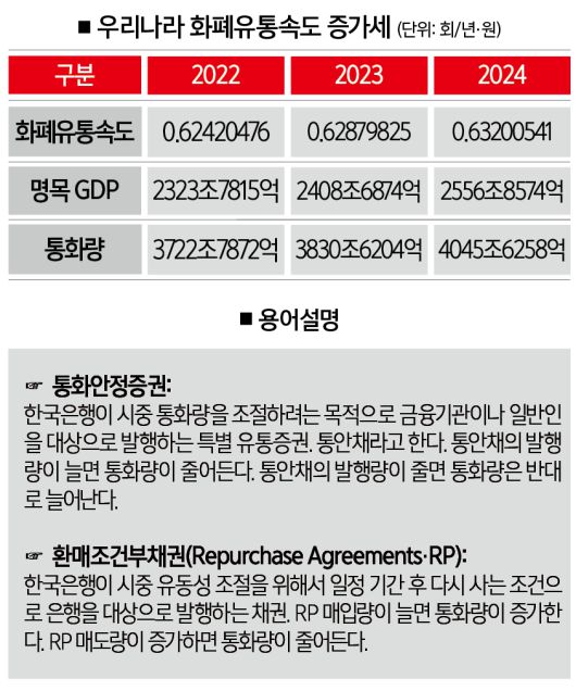 2015년 180조원에 달했던 통안채 잔액은 2019년까지만 해도 160조원대였지만, 2022년 112조7000억원, 2023년 121조6000억원, 2024년 1157조7000억원으로 급감했다. 통안채가 시중 통화를 흡수하지 못한 만큼 통화량은 증가한다.