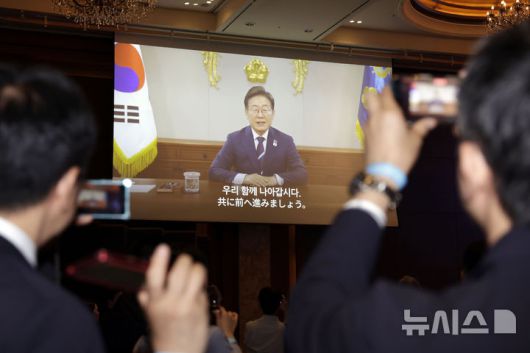 [서울=뉴시스] 최동준 기자 = 16일 서울 중구 롯데호텔에서 열린 주한일본대사관 주최 한일국교정상화 60주년 행사에서 이재명 대통령의 기념 메시지 영상이 나오고 있다. 2025.06.16. photocdj@newsis.com