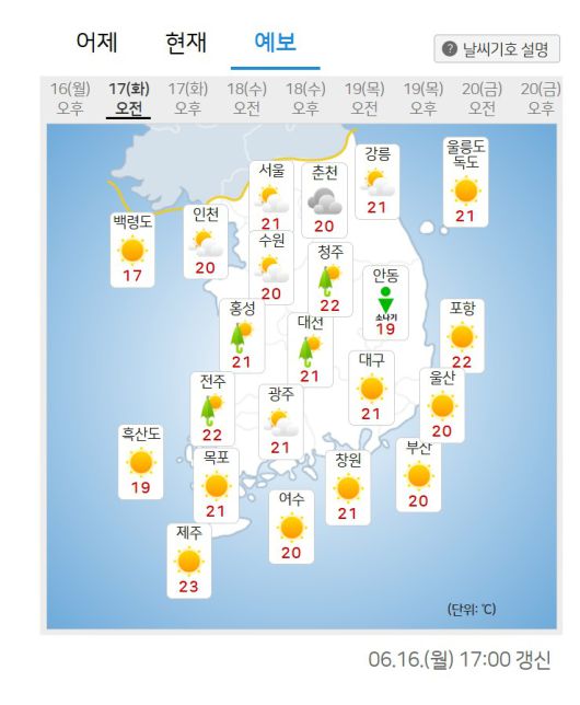 아침 최저기온은 서울 21도, 인천 20도, 대전 22도, 대구 21도, 광주 21도, 부산 20도, 강릉 21도, 제주는 23도 등으로 18~23도 사이의 분포를 보이겠다.