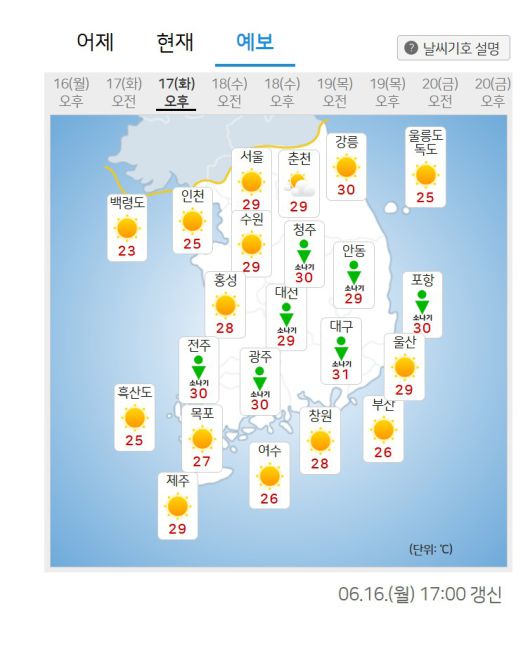 특히 대구, 광주, 전주 등 일부 지역에서는 천둥과 번개를 동반한 강한 소나기도 예보돼 야외 활동 시 유의가 필요하다.