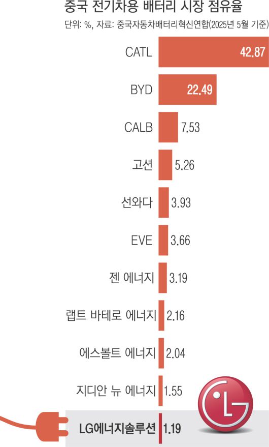 중국 전기차 시장은 ‘철옹성’으로 불릴 정도로 외국 배터리 업체가 진입하기 어려운 곳이다. 중국자동차배터리혁신연합(CABIA)에 따르면 지난달 기준 중국 전기차 시장 배터리 점유율은 CATL 42.9%, BYD 22.5%, CALB 7.5% 등으로 중국 업체가 95% 이상을 차지하고 있다.