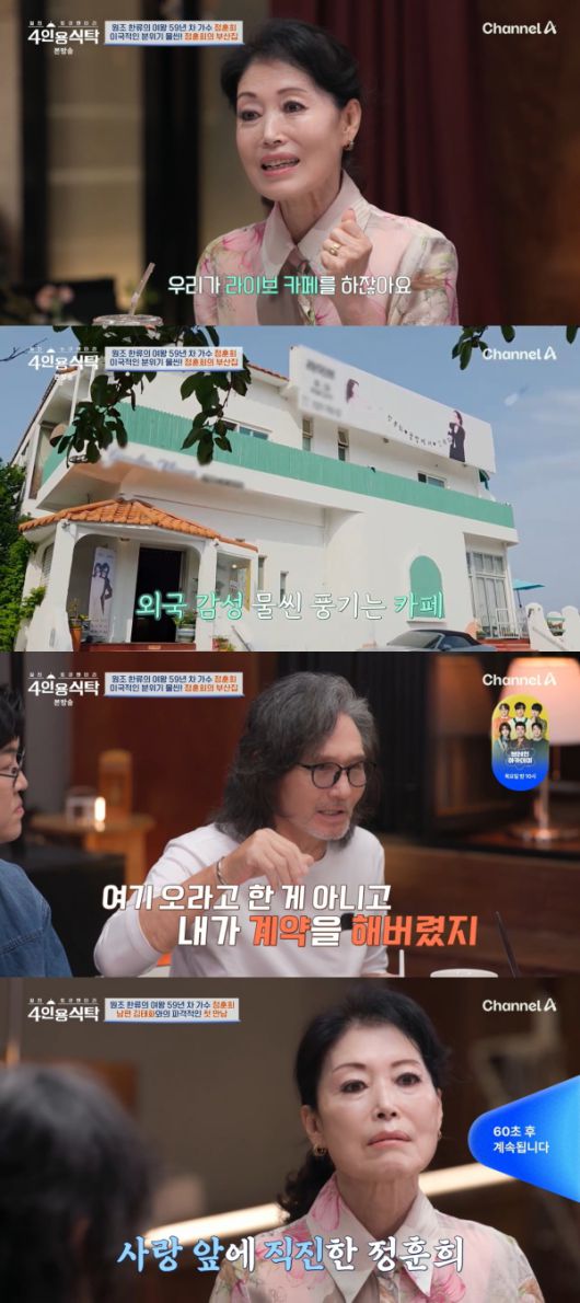 16일 방송된 채널A '절친 토큐멘터리 4인용 식탁'에는 정훈희가 데뷔곡 '안개'에 영감을 받아 연 전시를 기념해 가수 인순이, 박상민, 박구윤을 초대한 모습이 그려졌다. 이 자리에는 남편 김태화도 함께했다.