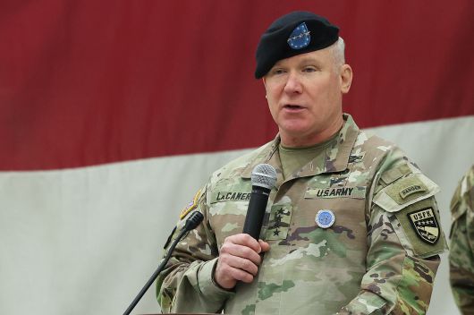 지난 2024년 1월 30일 경기도 평택시 주한미공군 오산기지에서 열린 미7공군사령관 이취임식에서 폴 러캐머라 주한미군사령관이 훈시하고 있다./연합뉴스 |