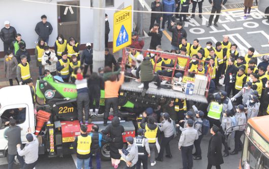 2019년 창원시 관계자가 창원 서성동 성매매 집결지 입구에 폐쇄회로(CC)TV를 설치하려고 하자 업주가 저지하고 있다. [연합뉴스] |