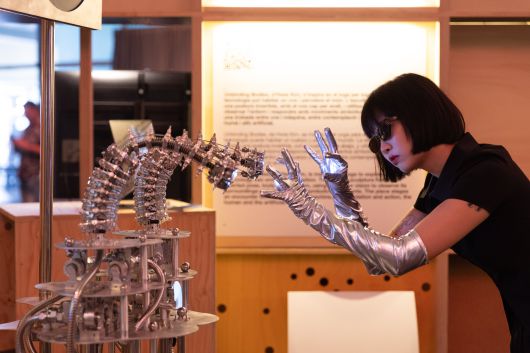 스페인 바르셀로나 피라 몬주익에서 열린 '소나르+D’ 행사에서 한국 작가 '여성을 위한 오픈기술랩'이 작품을 시연하고 있다. /ⓒAndreu Picher García, 아트코리아랩 제공 |
