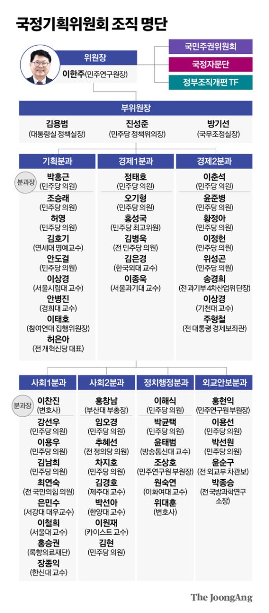 국정기획위는 이 위원장을 필두로 부위원장인 김용범 대통령실 정책실장과 진성준 더불어민주당 정책위의장, 방기선 국무조정실장이 주도하게 된다. 이번 기획위는 2017년 인수위 없이 출범한 문재인 정부의 ‘국정기획자문위원회’에 비해 규모가 확대됐다. 당시 6개이던 분과는 ▶국정기획 ▶경제1 ▶경제2 ▶사회1 ▶사회2 ▶정치행정 ▶외교안보 등 7개로 확대 편성됐고, 기획위원도 30명에서 55명으로 늘었다.
