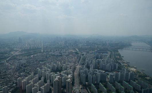 16일 한국부동산원에 따르면 올 5월 서울 아파트값은 전달 대비 0.54% 올랐다. 사진은 지난달 26일 서울 송파구 롯데월드타워 전망대 서울스카이에서 본 강남 지역 아파트. [뉴시스] |