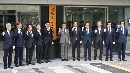 이한주 국정기획위원장(왼쪽 다섯 번째)과 진성준·김용범·방기선 부위원장 등 참석자들이 16일 서울 종로구 정부서울청사 창성동 별관에 마련된 위원회에서 현판식을 한 뒤 기념 촬영을 하고 있다. 이제원 선임기자 ⓒ 세상을 보는 눈, 세계일보