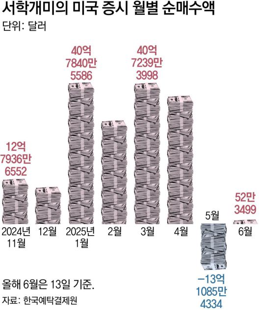 이처럼 변동성, 환율, 세금 이슈 등 ‘삼중고’가 겹치자 국내 투자자들은 지난달 미 증시에서 13억1085만 달러(약 1조7851억 원)를 순매도했다. 지난해 11월부터 올 4월까지 이어지던 6개월 연속 순매수 행진이 끝난 것이다.