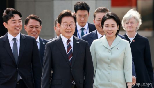 [성남=뉴시스] 고범준 기자 = 이재명 대통령과 김혜경 여사가 캐나다에서 열리는 주요 7개국(G7) 정상회의에 참석하기 위해 16일 경기 성남 서울공항에서 공군 1호기에 탑승하기 위해 이동하고 있다. 왼쪽부터 강훈식 비서실장, 황인권 경호처장, 이 대통령, 김혜경 여사, 타마라 모휘니 주한 캐나다 대사. 2025.06.16. bjko@newsis.com /사진=고범준 |