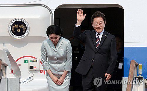 (성남=연합뉴스) 김인철 기자 = 주요 7개국(G7) 정상회의에 참석하는 이재명 대통령이 김혜경 여사와 16일 성남 서울공항 공군 1호기에서 출국하기 전 인사하고 있다. 2025.6.16 yatoya@yna.co.kr |