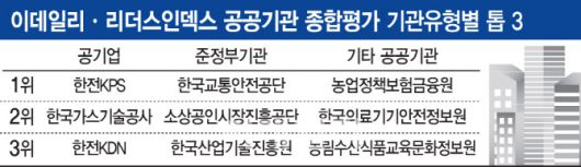 한전KPS는 지난해에 이어 올해도 공기업 1위를 차지했다. 사회적 약자 채용 등 사회통합 부문(1위)과 재무관리(5위), 복리후생(2위), 일자리(16위) 등 여러 분야에서 높은 점수를 받았다. 한국가스기술공사와 한전KDN도 재무실적을 개선하고 사회적 기여도를 높이며 상위권에 이름을 올렸다.