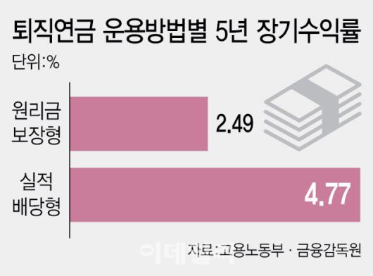 [이데일리 김나경 기자] 정부가 10년 장기 평균 운용수익률 연 2%대에 불과한 퇴직연금 수익률을 높이기 위해 디폴트 옵션(사전지정운용제도)에서 ‘원리금 보장형 상품’, 즉 은행 예·적금과 같은 상품을 제외하는 방안에 대해 검토 중이다. 퇴직연금 적립금의 80% 이상을 차지하는 원리금 보장형 상품의 수익률이 극히 저조한 데다 이재명 정부가 자본 시장 육성을 위한 ‘코스피 5000 시대’를 주요 정책으로 내세우면서 퇴직연금 수익률 제고와 증시 활성화란 ‘두 마리 토끼’를 잡기 위해서다.