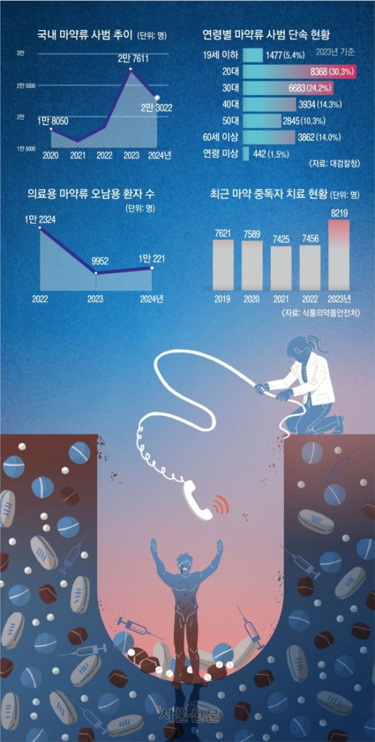 대검찰청 ‘2024 마약류 범죄백서’에 따르면 마약사범 중 20·30대 비중은 2023년 54.5%에서 지난해 60.8%로 늘었다. 10대 비율은 줄었지만 막막한 현실에 유혹을 느끼는 청소년도 여전하다. 상담사들은 고통을 듣고서도 직접 도울 수 없어 무력감을 느낄 때도 있다고 털어놨다.