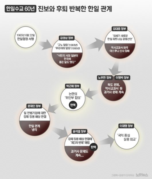 한국과 일본이 국교정상화 60주년을 맞았다. 과거사를 둘러싸고 진보와 후퇴를 거듭하는 한일 관계의 쳇바퀴는 아직도 '현재진행형'이다. 1965년 6월 22일 한일협정에 서명하면서 협력과 화합의 길을 열었지만, 잊을 만하면 덧나고 마는 과거사의 상처는 양국관계의 진전을 어렵게 했다. 윤석열 정부는 일본과의 관계개선에 대한 의지를 드러내며 합의점 찾기에 골몰했지만 계엄 선포로 탄핵되면서 모든 논의는 올스톱된 지 수개월째다. 이재명 정부의 새로운 탄생으로 한일간 안보 및 경제 협력뿐 아니라 과거사 문제 해결을 위한 의미있는 진전이 있을지 주목되고 있다. CBS노컷뉴스는 한일 국교정상화 60주년을 맞아 한일 관계를 진단하고 향후 우리나라의 대일 외교 현주소와 나아갈 방향을 짚어본다.