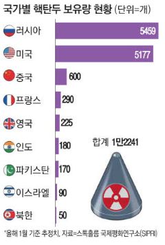 러시아가 5459개 핵탄두를 보유해 전세계 핵보유국 가운데 1위를 차지했다. 이어 같은 유엔 상임이사국이자 핵확산금지조약(NPT)상 공식 핵보유국인 미국(5177개), 중국(600개), 프랑스(290개), 영국(225개)이 뒤를 이었다. NPT체제 밖 국가들에서는 인도(180개), 파키스탄(170개), 이스라엘(90개), 북한(50개) 순으로 보유량이 많았다.