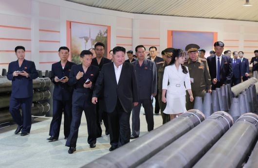 북한 노동당 기관지 노동신문은 김정은 당 총비서가 전날인 13일 중요군수공업기업소를 현지지도했다고 14일 보도했다. 사진은 김 총비서가 딸 주애와 함께 기업소 내부를 둘러보는 모습. [사진 = 뉴스1] |